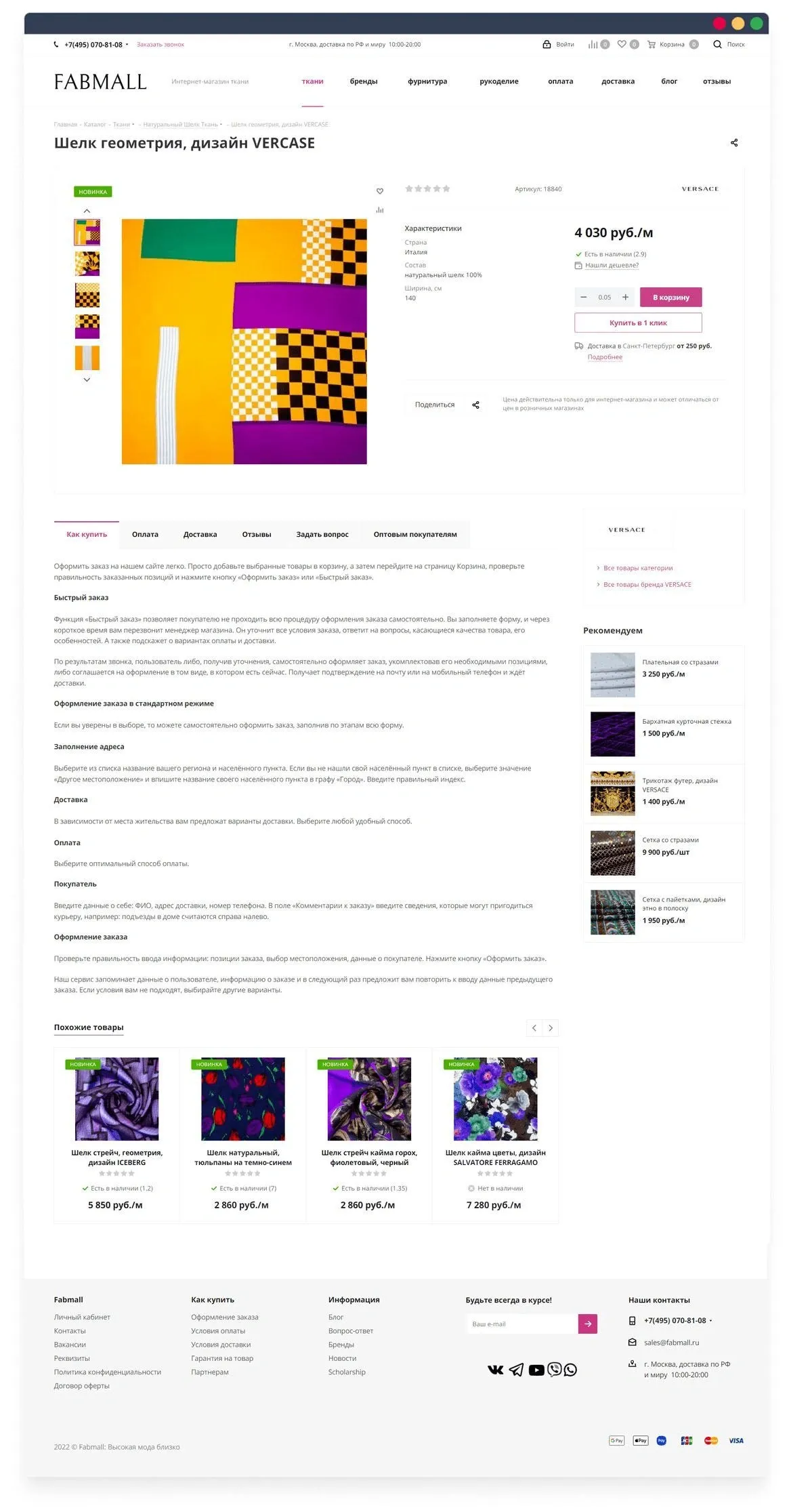 Сайт создан на лицензии Бизнес, что позволило настроить продажу не только рулонной ткани, но и реализовывать ткань на отрез любого метража.